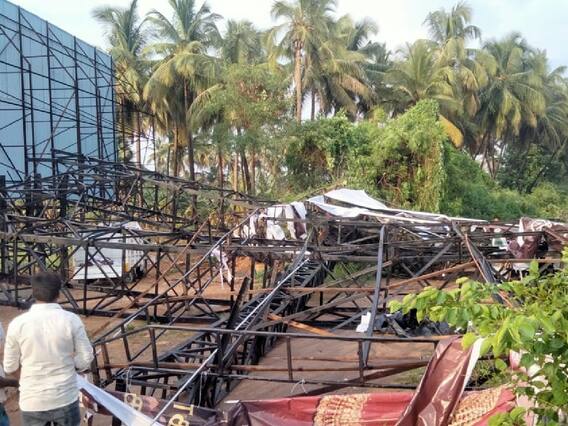 கோவை அருகே தனியார் நிறுவனத்தின் ராட்சத விளம்பர பேனர் பொருத்தும் போது, பலத்த காற்றுடன் மழை பெய்ததால் சாரம் சரிந்து விழுந்து விபத்துக்குள்ளானதில் 3 தொழிலாளர்கள் உயிரிழந்தனர்.