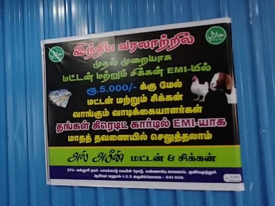 இ.எம்.ஐ என்று அழைக்கப்படும் சரிசம மாதாந்திர தவணை முறையில், ஒவ்வொரு மாதமும் குறிப்பிட்ட அளவு பணத்தை வங்கி அல்லது நிதி நிறுவனத்திற்கு வாங்கிய கடன் தொகையை முழுமையாகக் கட்டி முடிக்கும் வரை செலுத்த வேண்டும். இதில் திருப்பி செலுத்த வேண்டிய அசல் தொகையுடன் வட்டியும் சேர்த்தே, இ.எம்.ஐ மூலம் வசூலிக்கப்படும். அசல் மற்றும் வட்டியைச் சேர்த்து விருப்பமான கால அளவிற்கு ஏற்ப சரிசமமாக பிரிக்கப்படும். எவ்வளவு மாதங்கள் என தேர்வு செய்து, அவ்வளவு மாதம் பணத்தை தொடர்ந்து திரும்ப செலுத்த வேண்டும். நிலம், வீடு, வாகனம், செல்போன், வீட்டு உபயோக பொருட்கள் உள்ளிட்டவை வாங்க முழு தொகையை செலுத்த முடியாதவர்கள், குறிப்பிட்ட ஒரு தொகையை கட்டி விட்டு, கடனில் அதனை வாங்கிய பின்னர் இ.எம்.ஐ. முறை மூலம் மாதம் மாதம் பணத்தை செலுத்தி வருகின்றனர். இந்த நிலையில் கோவை குனியமுத்தூர் பகுதியில் இ.எம்.ஐ மூலமாக மட்டன், சிக்கன் வாங்கலாம் என்ற இறைச்சி விற்பனையாளரின் முயற்சி கவனத்தை ஈர்த்து வருகிறது.