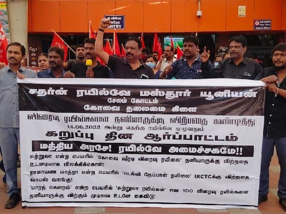 இந்நிலையில் ரயில்கள் தனியார்மயமாக்கப்படுவதற்கு எதிர்ப்பு தெரிவித்து, எஸ்.ஆர்.எம்.யூ எனப்படும் சதர்ன் ரயில்வே மஸ்தூர் யூனியன் அமைப்பினர் கருப்பு தினமாக அனுசரிக்கின்றனர். ரயில்கள் தனியார் வசம் ஒப்படைக்க எதிர்ப்பு தெரிவித்து, கோவை ரயில் நிலையம் முன்பு அந்த அமைப்பினர் ஆர்ப்பாட்டம் நடத்தினர். அப்போது கோவை முதல் சீரடி வரை தொடங்ப்பட்டுள்ள ரயிலை தனியாருக்கு அளித்ததை திரும்பப் பெற வேண்டும், டெல்லி நேபாளம் ரயிலை ஐஆர்சிடிசிக்கு விற்றதை வாபஸ் பெற வேண்டும், பாரத் கெளரவ் என்ற பெயரில் 100 விரைவு ரயில்களை தனியாருக்கு அளிக்கும் முடிவை உடனடியாக கைவிட வேண்டும் என வலியுறுத்தினர்.
