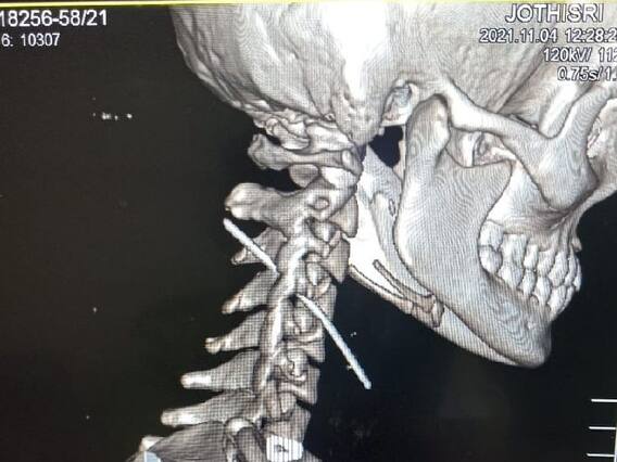 கோவை, தியாகராய நகர் பகுதியைச் சேர்ந்த 19 வயது இளம்பெண் ஒருவர், கழுத்தை அறுத்து கொண்டு தற்கொலைக்கு முயன்றுள்ளார். இதை அடுத்து கழுத்து அறுபட்ட நிலையில் கடந்த 2ஆம் தேதி கோவை அரசு மருத்துவ கல்லூரி மருத்துவமனையில் சிகிச்சைக்காக அனுமதிக்கப்பட்டார். அவரை பரிசோதித்த மருத்துவர்கள் கழுத்தில் வெளிப்புற காயங்கள் இருந்ததால் முதலுதவி செய்தனர். எனினும் கழுத்தில் ஏற்பட்ட காயம் குணமான பின்னரும், அவருக்கு கழுத்து வலி இருந்துள்ளது. இதனை அடுத்து அப்பெண்ணிற்கு சிடி ஸ்கேன் பரிசோதனை செய்த போது, 7.5 செ.மீ. அளவுக்கு நீளமான தையல் ஊசி, கழுத்தில் மூச்சு குழாயில் இருந்து கழுத்து தண்டு பகுதியில் மூளைக்கு செல்லும் ரத்தக்குழாய் அருகில் இருப்பது தெரியவந்தது. இது குறித்து மருத்துவர்கள் அவரிடம் கேட்ட போது, தற்கொலை செய்து கொள்ள தான் அந்த ஊசியை கழுத்தில் குத்தியதாக தெரிவித்துள்ளார்.