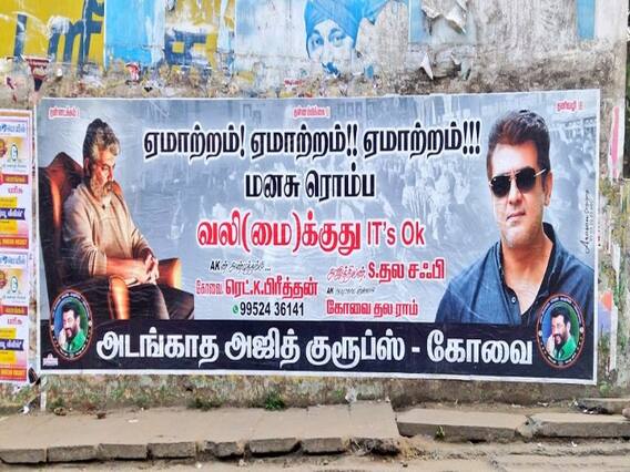 இதனிடையே கோவை ரயில் நிலையம் அருகே அஜித் புகைப்படங்களுடன் அடங்காத அஜித் குரூப்ஸ் - கோவை என்ற பெயரில் அஜித் ரசிகர்கள் சார்பில் போஸ்டர்கள் ஒட்டப்பட்டுள்ளன. அதில், "ஏமாற்றம்! ஏமாற்றம்!! ஏமாற்றம்!!! மனசு ரொம்ப வலி(மை)க்குது it's ok" என்று அச்சிட்டு தங்களது கவலையை அஜித் ரசிகர்கள் வெளிப்படுத்தி உள்ளனர். இந்த போஸ்டர்கள் தற்போது சமூக வலைதளங்களில் வைரல் ஆகி வருகின்றன.