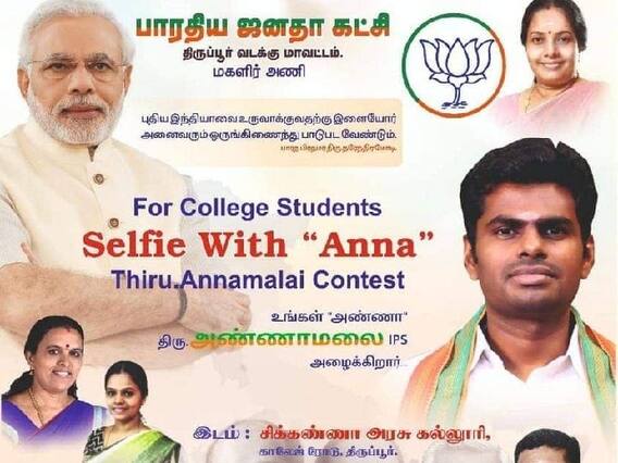 ’செல்பி வித் அண்ணா’ என்ற பெயரில் கல்லூரி மாணவர்கள் பாஜக மாநிலத் தலைவர் அண்ணாமலையுடன் ’செல்பி’ எடுக்கும் போட்டி நடத்தப்படுவதாக திருப்பூர் பாஜக வடக்கு மாவட்ட மகளிர் அணி சார்பில் விளம்பரங்கள் செய்யப்பட்டு இருந்தன. திருப்பூர் காலேஜ் ரோட்டில் உள்ள சிக்கண்ணா அரசு கல்லூரி மற்றும் எல்.ஆர்.ஜி. பெண்கள் கல்லூரியில் இப்போட்டி நடத்தப்படும் என அறிவிக்கப்பட்டு இருந்தது. கல்லூரி மாணவ, மாணவிகளுக்கான உறுப்பினர் சேர்க்கை சிறப்பு முகாம் எனவும், பாஜகவில் இணைந்து தேசத்துன் கரங்களை வலுப்படுத்துவோம் எனவும் அந்த விளம்பரங்களில் குறிப்பிடப்பட்டு இருந்தது. மேலும் செல்பி எடுக்கும் மாணவர்களுக்கு அண்ணாமலையின் கையெழுத்திட்ட உறுப்பினர் அட்டை உடனே வழங்கப்படும் எனவும் தெரிவிக்கப்பட்டு இருந்தது.