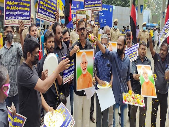பெட்ரோல், டீசல் விலை உயர்வை கண்டித்து பிரதமர் மோடி புகைபடத்திற்கு மலர் தூவி மரியாதை செலுத்தும் போராட்டம் நடத்திய தபெதிக அமைப்பினர் கைது செய்யப்பட்டனர்.