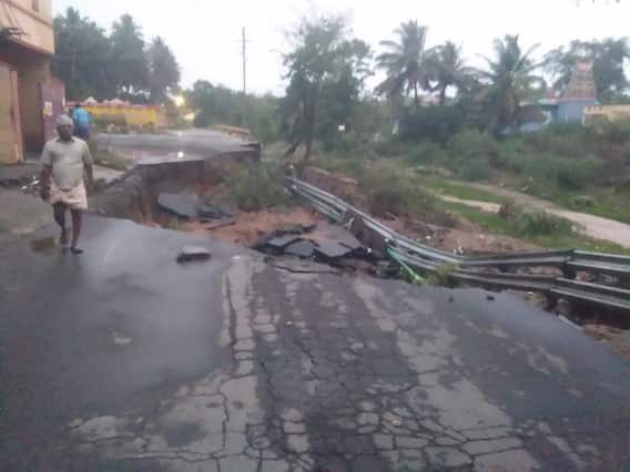 கோவை மதுக்கரை சுற்றுவட்டார பகுதிகளில் பெய்த தொடர் கனமழை காரணமாக மஞ்சப்பள்ளம் ஆற்றில் வெள்ளப்பெருக்கு ஏற்பட்டது. இதில் மதுக்கரை ஆற்று விநாயகர் கோவில் அருகே ஆற்றின் குறுக்கே கட்டப்பட்ட தரைப்பாலத்திற்கு 4 அடிக்கும் மேல் வெள்ள நீர் சென்றது. அப்போது அவ்வழியாக பணிக்குச் சென்று இரு சக்கர வாகனத்தில் வீடு திரும்பிய வீரப்பனூரை சேர்ந்த இளைஞர் ஒருவர் வெள்ள நீரில் சிக்கினார். இதனையடுத்து அப்பகுதியில் இருந்த மக்கள் கயிற்றின் மூலம் இருசக்கர வாகனத்தை கட்டி, தண்ணீரில் சிக்கிகொண்ட நபரை வாகனத்துடன் மீட்டனர். இதனிடையே தரைப்பாலத்தின் ஒரு பகுதியில் உடைப்பு ஏற்பட்டு, வெள்ள நீரில் அடித்து செல்லப்பட்டது. இதன் காரணமாக அப்பகுதியில் போக்குவரத்து பாதிக்கப்பட்டுள்ளது. இதனால் அப்பகுதி மக்கள் பல கிலோ மீட்டர் சுற்றி மாற்றுப்பாதையில் சென்று வருகின்றனர். வெள்ளத்தில் அடித்துச் செல்லப்பட்ட தரைப்பாலத்தை உடனடியாக சீரமைக்க வேண்டுமென அப்பகுதி மக்கள் வலியுறுத்தியுள்ளனர்.