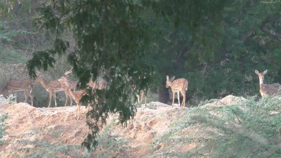 அரூர் அருகே வனப் பகுதியில் உள்ள குளத்தில் தண்ணீர் குடிக்க கூட்டமாக வரும் புள்ளி மான்கள். பருவமழை பொய்த்து போனதால் உணவு, தண்ணீர் தேடி வனப் பகுதியை விட்டு வெளியேறும் அபாயம்.