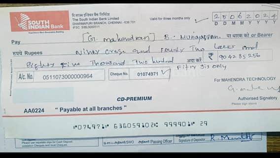 இந்த முனியப்பன் கோயில் வரும் பக்தர்கள் காணிக்கையாக செலுத்தி வருகின்றனர். இந்த உண்டியலை அறநிலையத்துறை அதிகாரிகள் மாதத்துக்கு ஒரு முறை உண்டியலை திறந்து அதில் இருக்கும் பணத்தை எடுத்து வருகின்றனர். இந்து அறநிலையத்துறை சார்பில் வைக்கப்பட்டுள்ள உண்டியலை நேற்று தருமபுரி அறநிலையத்துறை அதிகாரிகள் முன்னிலையில், உண்டயலை திறந்து, பணம் எண்ணும் பணியில் கோவில் ஊழியர்கள் ஈடுபட்டனர். அப்போது அந்த உண்டியலில் ஒரு காசோலை இருந்ததை எடுத்தனர். அதில் 90 கோடியே 42 லட்சத்து 85 ஆயிரத்து 256 ரூபாய் இருந்ததை கண்டு அதிர்ச்சி அடைந்த அதிகாரிகள் ஆச்சரியமடைந்தனர். உடனே காசோலையை கைப்பற்றிய அதிகாரிகள் அதில் மகேந்திரா டெக்னாலஜி என்ற பெயரில், சவுத் இந்தியன் வங்கிக்கான கணக்கில் காசோலையில் போடப்பட்டது தெரியவந்துள்ளது.