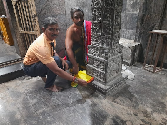 இங்குள்ள தூண் ஒன்றில் நரசிம்ம அவதாரம் உள்ளது. பூ வேலைப்பாடுகளும் நுணுக்கமாக காட்டப்பட்டுள்ளன. சிவன் யானையின் தோலை உரித்து நின்று நடனமாடும் வகையிலும் ஒரு சிற்பம் அமைந்துள்ளது. இத்தூணியில் உள்ள சிற்பங்கள் அனைத்தும் சுமார் 4 அங்குலம் அளவிற்கு மட்டுமே அமைக்கப்பட்டுள்ளது என்பது குறிப்பிடத்தக்கது ஆனால் அனைத்தும் தெளிவாக அமைக்கப்பட்டுள்ளது.