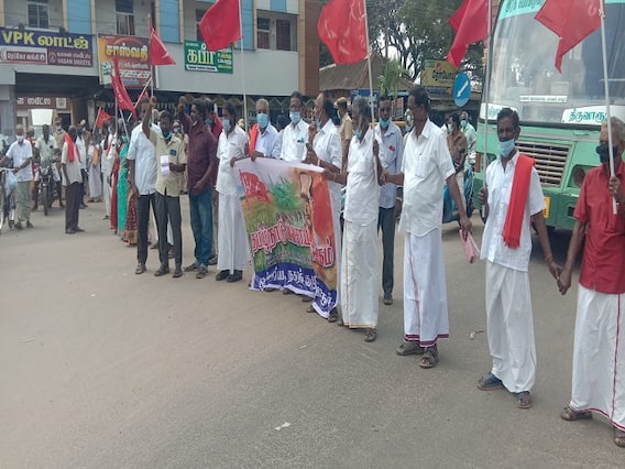 திருவாரூர் மாவட்டத்தில் இந்த ஆண்டு 3 லட்சத்து 75 ஆயிரம் ஏக்கர் பரப்பளவில் சம்பா மற்றும் தாளடி நெல் சாகுபடி பணிகளில் விவசாயிகள் ஈடுபட்டு வருகின்றனர். இந்த நிலையில் கடந்த ஒன்று மற்றும் இரண்டாம் தேதி மூன்றாம் தேதிகளில் பெய்த கனமழையின் காரணமாக ஆயிரக்கணக்கான ஏக்கர் சம்பா மற்றும் தாளடி நெல் பயிர்கள் அறுவடைக்கு தயாராக இருந்த நிலையில் கனமழையால் மழை நீரில் மூழ்கியது. இதனால் விவசாயிகள் மிகப்பெரிய பொருளாதார இழப்பை சந்தித்திருந்தனர். உடனடியாக பாதிக்கப்பட்ட நெல் பயிர்களுக்கு உரிய இழப்பீடு வழங்க வலியுறுத்தி தொடர்ந்து விவசாயிகள் பல்வேறு கட்ட போராட்டங்களை நடத்தி வருகின்றனர். இந்த நிலையில் திருவாரூர் பழைய பேருந்து நிலையம் முன்பாக தமிழ்நாடு விவசாயிகள் சங்கத்தின் மாநிலச் செயலாளர் மாசிலாமணி தலைமையில் விவசாயிகள் பல்வேறு கோரிக்கைகளை வலியுறுத்தி சாலை மறியல் போராட்டத்தில் ஈடுபட்டனர்.