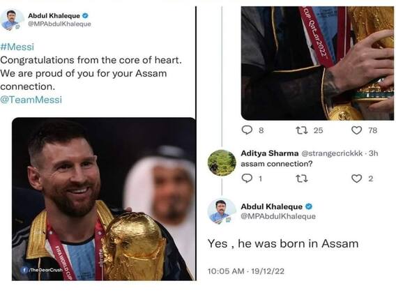 இந்தநிலையில், மெஸ்ஸி உலகக் கோப்பை வென்றதற்கு பாராட்டு தெரிவித்து காங்கிரஸ் எம்பி அப்துல் காலீக் தனது ட்விட்டர் பக்கத்தில் வாழ்த்து தெரிவித்திருந்தார். அதில், "இதயத்தின் மையத்தில் இருந்து வாழ்த்துக்கள். உங்களின் அஸ்ஸாம் இணைப்பிற்காக நாங்கள் பெருமைப்படுகிறோம் @teammessi" என்று பதிவிட்டு இருந்தார்.
