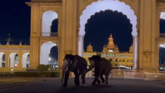 Mysore Dasara Elephants Clash: அமைதிக்கு பெயர் பெற்ற தசரா யானைகள் மைசூர் வளாகத்தில் மோதிக் கொண்டு ஓடியது அப்பகுதியில் அசாதாரண சூழலை ஏற்படுத்தியது.