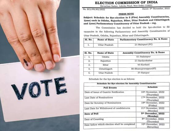 ஒடிசா, ராஜஸ்தான், பீகார், உத்தரபிரதேசம் மற்றும் சத்தீஸ்கர் ஆகிய மாநிலங்களில் இடைத்தேர்தல் தேதியை இந்திய தேர்தல் ஆணையம் அறிவித்துள்ளது. அதன்படி, டிசம்பர் 5-ம் தேதி வாக்குப்பதிவு நடைபெறும் என்றும், டிசம்பர் 8-ம் தேதி வாக்குகள் எண்ணப்படும் என்றும் தெரிவிக்கப்பட்டுள்ளது.