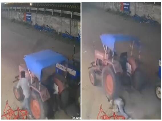 வெளியே நிறுத்தப்பட்டுள்ள டிராக்டர்களை கண்காணிப்பதற்காக சி.சி.டி.வி. காட்சிகளும் பொருத்தப்பட்டுள்ளது. இதை நோட்டமிட்ட திருடன் ஒருவன் அதில் ஒரு டிராக்டரை திருட திட்டமிட்டுள்ளார். இதன்படி, இரவு நேரத்தில் யாரும் இல்லை என்பதை உறுதி செய்து கொண்ட அந்த திருடன், டிராக்டரின் பின் சக்கரத்தின் அருகில் நின்று கொண்டு டிராக்டரை ஆன் செய்துள்ளான். ஆனால், எதிர்பாராத விதமாக டிராக்டர் முன்னோக்கி செல்லத் தொடங்கியது.