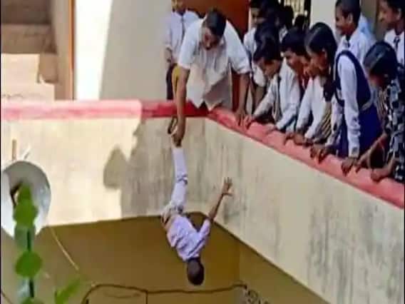 உத்தரப்பிரதேச மாநிலம் மிர்சாபூரில் உள்ள பள்ளி ஒன்றில் சோனு யாதவ் என்ற மாணவர் 2 ஆம் வகுப்பு படித்து வருகிறார். இவர் அருகில் மதிய உணவு இடைவெளி நேரத்தில் சக மாணவனை கடித்ததாக கூறப்படுகிறது. இது தொடர்பாக கடி வாங்கிய மாணவன் சோனு யாதவ் மீது ஆசிரியர்களிடம் புகார் அளித்து உள்ளார். இந்த புகார் பள்ளியின் தலைமை ஆசிரியர் மனோஜ் விஸ்வகர்மாவுக்கு எட்டியது. ஆத்திரம் அடைந்த தலைமை ஆசிரியர் மனோஜ், சக மாணவனை கடித்ததற்காக மாணவன் சோனு யாதவை பள்ளியின் மேல் மாடிக்குக்கு இழுத்துச் சென்று உள்ளார். அங்கு மாணவனின் கால்களை பிடித்து தூக்கி தலைகீழாக வைத்த தலைமை ஆசிரியர் மனோஜ் விஸ்வகர்மா, தடுப்புச் சுவருக்கு வெளியே சோனு யாதவை அந்தரத்தில் தொங்கவிட்டார்.