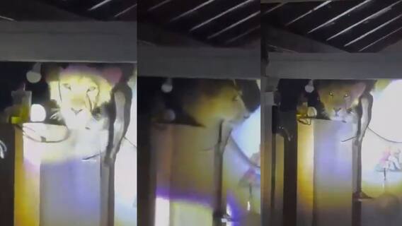 சுவரில் அமர்ந்திருக்கும் சிங்கம், ஆர்வத்துடன் சமையலறைக்குள் எட்டிப் பார்க்கும் காட்சி கேமராவில் பதிவாகியுள்ளது. ஒரு கிராமவாசி தனது முகத்தில் டார்ச் லைட்டைப் பாய்ச்சும்போது, சிங்கம் சிறிது நேரம் கேமராவை நேராகப் பார்த்த நிலையில் அதன் கண்கள் இருளில் ஒளிர்ந்த நிலையில் தற்போது இந்த வீடியோ வைரலாகியுள்ளது.