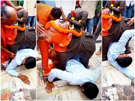 அந்த நபர் சிலையின் அடியில் படுத்துக் கொண்டு, கை, கால்களைப் பயன்படுத்தி சக்தியைப் பிரயோகித்து அதன் வழியாகச் செல்ல முயற்சிக்கிறார். ஆனால், அவரால் உள்ளே நுழைய முடியவில்லை. இதனை செய்யும்போது அவரைச் சுற்றிலும் பலர் சூழ்ந்துள்ளனர். அனைவருடனும் சேர்ந்து கோவில் பூசாரியும் அந்த நபருக்கு வெளியே வர உதவுவதைக் காண முடிகிறது. ஆனால் இவ்வளவு பேர் முயற்சித்தும், எந்த பயனும் இன்றி அவர் உள்ளேயே சிக்குண்டு இருக்கிறார். இந்த விடியோ வைரலாகி வரும் நிலையில் பலர் அவர் குறித்து கமென்டில் எழுதி வருகின்றனர். நாய் கூட அழகாக சாமியை கும்பிட்டு எழுந்து செல்லும் நிலையில் மனிதர்களுக்கு என்ன என்று கேள்வி எழுப்புகின்றனர்.