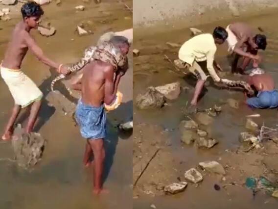 இந்நிலையில், சீற்றமடைந்த மலைப்பாம்பு அவரது கழுத்தை இறுக்கத் தொடங்கியுள்ளது. தொடர்ந்து, பாம்பிடமிருந்து விடுபட ராம் எவ்வளவோ போராடியும் முடியாத நிலையில், உடன் இருந்தவர்கள் செய்வதறியாது திகைத்துள்ளனர்.