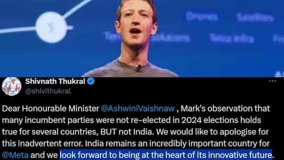 இந்த நிலையில், 2024 தேர்தல்கள் குறித்த மார்க் ஜூக்கர்பெர்க்கின் கருத்திற்கு மெட்டா இந்தியா நிறுவனம் மன்னிப்பு கோரியுள்ளது. இது குறித்து, அந்நிறுவனத்தின் துணைத் தலைவர் ஷிவ்நாத் துக்ரால், மத்திய அமைச்சர் அஸ்வினி வைஷ்ணவ்விற்கு பதிலளிக்கும் விதமாக, எக்ஸ் தளத்தில் பதிவிட்டுள்ள அறிக்கையில், 2024 தேர்தல் குறித்த மார்க் ஜூக்கர்பெர்க்கின் கருத்து, பல நாடுகளுக்கு பொருந்தும் எனவும் இந்தியாவிற்கு அல்ல எனவும் தெரிவித்துள்ளார். மேலும், ஜூக்கர்பெர்க்கின் கருத்துக்களை கவனக்குறைவான கருத்து என கூறி வருத்தம் தெரிவித்துள்ள ஷிவ்நாத் துக்ரால், அதற்காக மன்னிப்பு கேட்க விரும்புவதாகவும் தெரிவித்துள்ளார். மேலும், மெட்டாவிற்கு இந்தியா ஒரு மிகமுக்கியமான நாடாக விளங்குவதாகவும், புதுமையான இந்தியாவின் எதிர்காலத்தின் இதயத்தி இருக்க விரும்புவதாகவும் பதிவிட்டுள்ளார்.