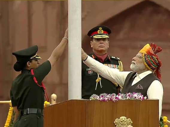 பிரதமர் மோடி தேசிய கொடி ஏற்றிவைக்க செங்கோட்டைக்கு வந்தடைந்த பின் நாட்டின் முப்படை வீரர்களின் அணிவகுப்பை ஏற்றுக்கொண்டார். அதனை தொடர்ந்து 77வது சுதந்திர தினத்தையொட்டி டெல்லி செங்கோட்டையில் தேசியக் கொடியை ஏற்றி வைத்தார் பிரதமர் மோடி.