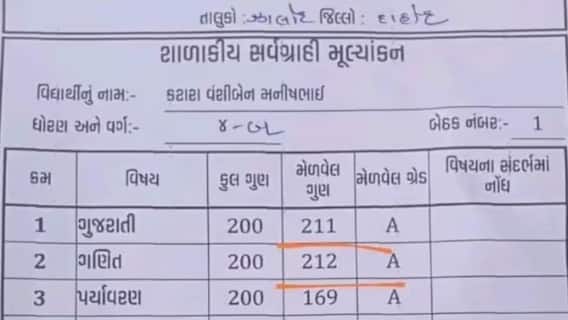 சமீபத்தில், வன்ஷிபென் படித்து வரும் ஆரம்பப் பள்ளியில் மொழிப்பாடம் உள்ளிட்ட 6 பாடங்களுக்கு நடந்த முதன்மைத் தேர்வு முடிவு வெளியானது. அதில், குஜராத்தி பாடத்தில் 200க்கு 211 மதிப்பெண்களும், கணிதப் பாடத்தில் 200க்கு 212 மதிப்பெண்கள் பெற்றுள்ளதாக மதிப்பெண் சான்று வெளியானது.