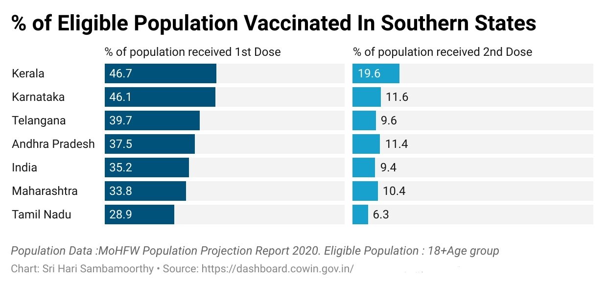 தமிழ்நாட்டில் கொரோனா தடுப்பூசி பயனாளிகளில் 28.9% பேர் மட்டுமே முதல்கட்ட தடுப்பூசி டோஸ்களை போட்டுக் கொண்டுள்ளனர். 6.3% பயனாளிகள் மட்டுமே இரண்டுகட்ட தடுப்பூசி டோஸ்களையும் போட்டுக் கொண்டுள்ளனர். இது, தேசிய சராசரி தடுப்பூசி எண்ணிக்கையை விட தமிழ்நாட்டில் குறைவாக உள்ளது.