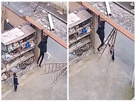 அந்த வீடியோவில் இளம்பெண் ஒருவர் ஏணியின் உதவியுடன் 7 அடி உயரத்தில் மேலே நின்று கம்பி ஒன்றில் ஏதோ வேலை பார்த்துக் கொண்டிருக்கிறார். கீழே அவரது மகன் தனது தாயை வேடிக்கை பார்த்துக் கொண்டிருக்கிறான். அந்த சிறுவனுக்கு 3 அல்லது 4 வயது மட்டுமே இருக்கும்.
