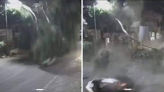 விரார் பகுதியில் டெலிவரி செய்யும் இளைஞர் ஒருவர் ஸ்கூட்டரில் வந்து கொண்டிருந்த போது மரம் சரிந்து விழுந்ததில் மயிரிழையில் உயிர் தப்பிக்கும் வீடியோ சமூக வலைதளங்களில் வைரலாகி வருகிறது. விரார் மாவட்டம், அகாஷி சல்பேத்தில் உள்ள மகாராஷ்டிரா வங்கி அருகே இரவு 10:30 மணியளவில் இந்த அதிர்ச்சியூட்டும் சம்பவம் நிகழ்ந்தது.