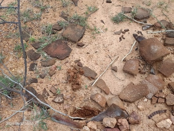 இதுகுறித்து முனீஸ்வரன் நம்மிடம், “பெருங்கற்காலத்தில் சேர்ந்த புதைந்த நிலையில் சுமார் 13-க்கும் மேற்பட்ட முதுமக்கள் தாழிகள் மேற்குப்பகுதியில் உடைந்த நிலையிலும் புதைந்த நிலையிலும் உள்ளன. குறிப்பாக இதன் உள்ளே கருப்பு சிவப்பு நிறத்தில் மெல்லிய தடித்த பானைகள் ஓடுகள், உடைந்த கருவளையம் உள்ளது. ஒரு முதுமக்கள் தாழி சுமார் 74 சென்டி மீட்டர் விட்டத்தில் இரண்டு இன்ச் தடிமன் கொண்ட நிலையில் புதைந்து இருக்கிறது. மற்றொன்று இதை விட சிறியதாக 60 சென்டி மீட்டர் விட்டத்தில் ஒரு இன்ச் தடிமனிலும் உடைந்த நிலையில் இருக்கிறது. தாழியின் உடைந்த ஓட்டின் வெளிப்பகுதியில் தாய் தெய்வம் போன்ற குறியீடுகள் காணப்படுகின்றன. குறிப்பாக மனிதன் இறந்த பின் மீண்டும் தாயின் கருவறைக்குள் சென்று பிறக்கிறான் என ஆதிமனிதன் அகன்று கருவுற்ற தாயின் வயிற்றைப் போன்ற அமைக்கப்பட்டிருக்கிறது.