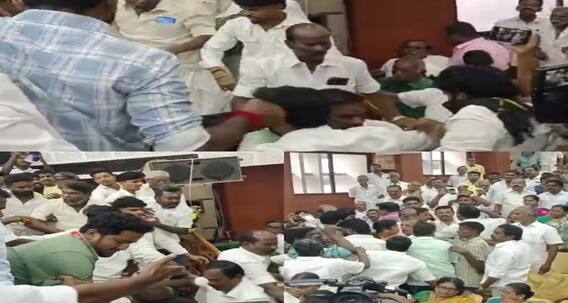 இதையடுத்து கடந்த 11-ஆம் தேதி நியமிக்கப்பட்ட குழு சார்பாக, எடப்பாடி கே.பழனிசாமி தலைமையில் கூட்டம் நடைபெற்றது. அதனை தொடர்ந்து நியமிக்கப்பட்ட தலைவர்கள் தங்களுக்கு ஒதுக்கப்பட்ட இடங்களில் கள ஆய்வுக் கூட்டம் நடத்தி வருகின்றனர். இந்த நிலையில் நெல்லை, கும்பகோணம் கள ஆய்வுக் கூட்டத்தில் மோதல் வெடித்தது. முன்னாள் அமைச்சர் எஸ்.பி வேலு மணி தலையில் நடைபெற்ற ஆய்வுக் கூட்டத்தில் நடைபெற்ற பிரச்னையால் பரபரப்பு ஏற்பட்டது. இன்று மதுரையில் அதிமுக மாநகர் மாவட்ட கழகம் சார்பில் மதுரையில் உள்ள மத்திய தொகுதி, மேற்கு, வடக்கு, மற்றும் தெற்கு என நான்கு சட்டமன்ற தொகுதிகளுக்கான கள ஆய்வுக் கூட்டம் நடைபெற்று வருகிறது. இந்நிலையில் மதுரையில் நடைபெற்ற ஆய்வு கூட்டத்தில் தள்ளு முள்ளு ஏற்பட்டு அடிதடியானது, பரபரப்பு ஏற்பட்டுள்ளது.