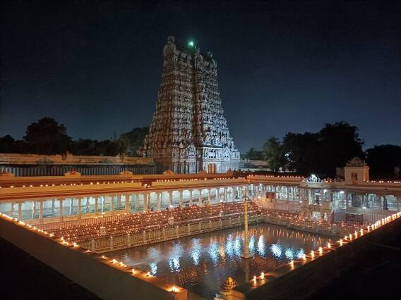 4. உலக புகழ்பெற்ற மதுரை மீனாட்சியம்மன் கோயிலில் கார்த்திகை திருநாளை முன்னிட்டு லட்சம் தீ ஏற்றப்பட்டது. இதனால் மீனாட்சியம்மன் கோயில் தெப்பக்குளம் ஜொலித்தது.