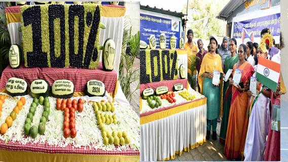 அதன்படி இன்றைய தினம் தர்பூசணியில் தேர்தல் ஆணையத்தின் இலச்சினை வடிவம், ஸ்வீப் லோகோ, 100% வாக்களிப்போம், 18 வயது முதல் வாக்காளர்கள் போன்ற தேர்தல் விழிப்புணர்வு படங்களும், என் வாக்கு விற்பனைக்கு அல்ல, என் வாக்கு எனது உரிமை, தேர்தல் திருவிழா தேசத்தின் பெருவிழா, தேர்தல் தேதி, நம் வாக்கு நம் உரிமை, வாக்களிப்பது நமது ஜனநாயக கடமை, மக்களைத் தேர்தல் – 2024 போன்ற தேர்தல் விழிப்புணர்வு வாசகங்கள் தர்பூசணி, காய்கறிகள் மற்றும் பழங்கள் கொண்டு வடிவமைத்து வாக்காளர்களிடம் 100% வாக்களிப்பதன் அவசியம் குறித்து விழிப்புணர்வு ஏற்படுத்தும் நிகழ்ச்சி நடைபெற்றது.