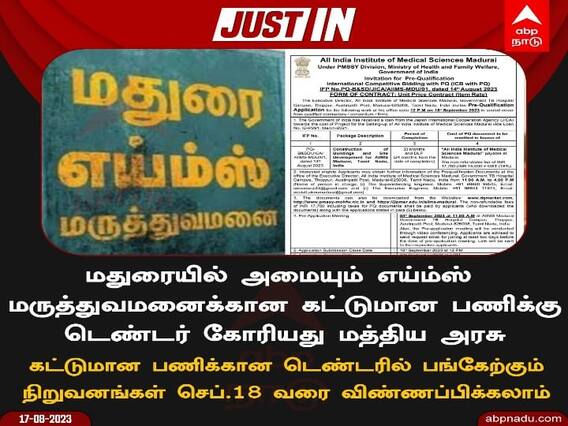 கட்டிட பணிகளுக்கான முன் தகுதி ஆவணங்களை Executive Director, All India Institute of Medical Sciences Madurai, Government TB Hospital Campus, Thoppur, Austinpalti Post, Madurai-625008, Tamil Nadu, India from 11.00 A.M. to 4.00 P.M (Name of person in charge: (i) The Superintending Engineer, Mobile: +91 98880 99545, Email: semadurai45@gmail.com and (ii) The Executive Engineer, Mobile: +91 98944 11974, Email: eecivil.aiimsmadurai@gmail.com ) என்ற முகவரிக்கு அனுப்பவும். ஒப்பந்த பணிகளுக்கான விண்ணப்பங்களை www.dgmarket.com, http://www.pmssy-mohfw.nic.in and https://jipmer.edu.in/alims- madural. என்ற இணைய தள பக்கத்தில் டவுண்லோட் செய்துகொள்ளலாம் எனவும் அறிவிப்பு வெளியிடப்பட்டுள்ளது. கட்டிட பணிகளுக்கான ஒப்பந்தம் வெளியிடப்பட்டுள்ள நிலையில் 2026ஆம் ஆண்டிற்குள் பணிகள் முடியும் என கூறிவரும் நிலையில் கட்டிட பணிகள் எப்போதும் தொடங்கும் என்பதற்கான கேள்விக்கான விடை எப்போது கிடைக்கும் என எதிர்பார்க்கப்படுகிறது.