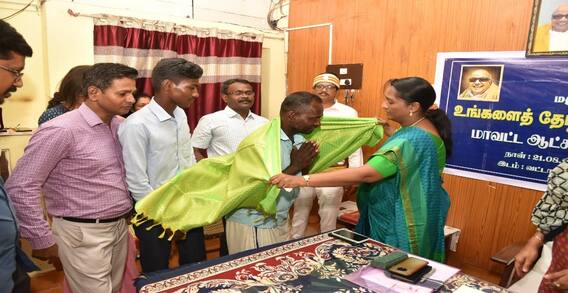 பேரையூர் வட்டாட்சியர் அலுவலகத்தில், தனது மகனின் கல்விக்கு உறுதுணையாக இருந்த எழுமலை அரசு ஆண்கள் மேல்நிலைப் பள்ளிக்கு ஊதியம் பெறாமல் மராமத்துப் பணிகளை மேற்கொண்ட உத்தபுரத்தை சேர்ந்த கட்டட பணியாளர் அழகு முருகன் அவர்களின் தன்னலம் கருதாத நெகிழ்வான செயலை மதுரை மாவட்ட ஆட்சியர் சங்கீதா பாராட்டி பொன்னாடை அணிவித்து கௌரவித்தார்.