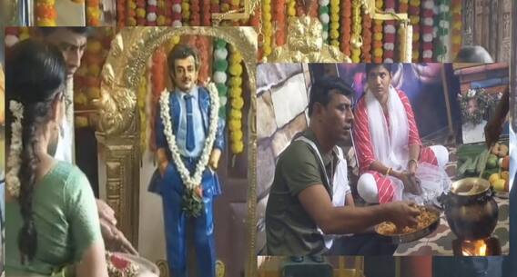 தமிழ் புத்தாண்டு தினத்தையொட்டியும், கூலி திரைப்படம் அமோக வெற்றி பெற வேண்டியும், திருமங்கலம் ரஜினி கோவிலில் பொங்கல் வைத்து ரஜினியின் முழு உருவ கற்சிலைக்கு சிறப்பு அபிஷேகம் செய்து தனது குடும்பத்தினருடன் வழிபாடு செய்தனர்.