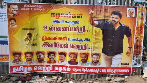 தற்போது நடிகர் விஜய் தமிழக வெற்றி கழகம் என்கிற புதிய அரசியல் கட்சித் தொடங்கியிருக்கிறார். தேர்தல் ஆணையம் அங்கீகாரம் வழங்கியதும் கட்சியின் கொடி, சின்னம் அறிவிக்கப்படும் என்று அவர் தெரிவித்துள்ளார். விஜய் அரசியல் கட்சித் தொடங்குவது என்பது பல காலமாக பேசப்பட்டு வந்தாலும், நேற்று அரசியல் கட்சியைத் தொடங்கியிருப்பது தமிழக அரசியலில் பரபரப்பை ஏற்படுத்தியிருக்கிறது. விஜயின் அரசியல் வருகை அவர்களது ரசிகர்கள் மத்தியில் பெரும் உற்சாகத்தை ஏற்படுத்தியுள்ளது. இந்நிலையில் அவரது ரசிகர்கள் மதுரையில் ஒட்டி உள்ள போஸ்டரில் அனைத்து கட்சிகளின் கொடி வண்ணங்களில் ஆன வார்த்தைகளில் "கழகங்கள் இனி கதறும் உன்னைப் பற்றி, திலகங்கள் உனக்கு இட இனிமேல் வெற்றி" 2026 நாளைய தீர்ப்பு என சட்டமன்றம் அடங்கிய புகைப்படத்துடன் ஆன போஸ்டரை மதுரையில் பல்வேறு பகுதிகளில் கட்சியினர் ஒட்டி உள்ளனர்.