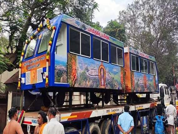 2 பெட்டிகள் கொண்ட மின்இழுவை ரெயிலில் சுமார் 35 பேர் வரை பயணம் செய்யலாம். இந்தநிலையில் பழனி முருகன் கோவில் அறங்காவலர் குழு தலைவர் சந்திரமோகன், தனது செலவில் பழனி கோவிலுக்கு 2 மின்இழுவை ரயில்பெட்டிகள் வழங்க முடிவு செய்தார். அதன்படி 2 மின்இழுவை ரயில் பெட்டிகள் சென்னையில் உள்ள தனியார் நிறுவனத்தில் தயார் செய்யப்பட்டது. டி.வி., குளிர்சாதன வசதி என பல்வேறு அம்சங்களுடன் தயாரான இந்த ரெயில் பெட்டிகள் ராட்சத லாரியில் ஏற்றப்பட்டு பழனிக்கு கொண்டுவரப்பட்டது.