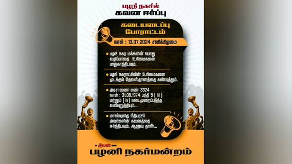 தொடர்ந்து பழனி நகராட்சி கூட்டத்திலும் திருக்கோவிலுக்கு எதிராக தீர்மானங்களும் நிறைவேற்றப்பட்டது. தற்போது பழனி கோயில் நிர்வாகத்தை கண்டித்து நகர்மன்றம் சார்பில் வருகின்ற ஜூலை 13ஆம் தேதி ஓய்வு பெற்ற நீதிபதி பாரதிதாசன் குழுவினர் ஆய்வு செய்ய வருகை தர உள்ளனையில் அன்றைய தினத்தில் பழனியில் அனைத்து கடைகளும் அடைக்கப்பட்டு கவன ஈர்ப்பு போராட்டம் நடைபெறும் என அறிவித்துள்ளது.