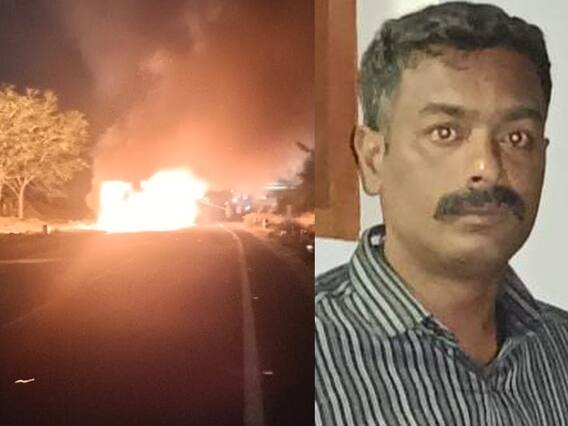 இதேபோல் சின்னமனூர் காவல் நிலையத்தில் முதல் நிலை காவலராக பணியாற்றி வந்த ராமகிருஷ்ணன் (40) மோட்டார் சைக்கிளில் எதிரே வந்து கொண்டிருந்தார். அப்போது எதிர்பாராதவிதமாக ஆம்னி பேருந்தும், மோட்டார் சைக்கிளும் நேருக்குநேர் மோதிக்கொண்டன. இதில், மோட்டார் சைக்கிள் பேருந்தின் முன்பகுதியில் சிக்கியது. அதேபோல் மோட்டார் சைக்கிள் மோதிய வேகத்தில் பேருந்தின் முன்பகுதியில் இருந்த பெட்ரோல் டேங்கில் கசிவு ஏற்பட்டு, தீப்பிடித்தது.