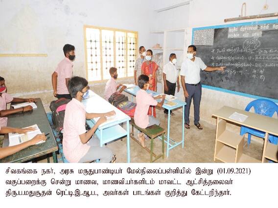 கொரோனா பரவல் தடுப்பு நடவடிக்கையாக கடந்த 6 மாத காலமாக பள்ளிகள் மூடப்பட்டிருந்த நிலையில் பள்ளிகளில் 9,10,12 ஆம் வகுப்பு மாணவர்களுக்கு மட்டும் கொரோனா வழிகாட்டு நெறிமுறைகளுடன் பள்ளிகளை திறக்க அரசு உத்தரவிட்டு திறக்கப்பட்டது. இன்நிலையில் சிவகங்கை மாவட்டத்தில் உள்ள 445 அரசு, அரசு உதவிபெறும் மற்றும் தனியார் பள்ளிகள் திறக்கப்பட்டு ஆசிரியர்கள் மூலம் பாடம் எடுக்கப்பட்டுவரும் நிலையில் சிவகங்கை ஆட்சியர் அலுவலக வளாகத்தில் உள்ள மருதுபாண்டியர் அரசு மேல் நிலைப்பள்ளியில் கொரோனா வழிகாட்டு நெறிமுறைகள் பின்பற்றப்படுவது குறித்து மாவட்ட ஆட்சியர் மதுசூதன் ரெட்டி நேரில் சென்று ஆய்வு மேற்கொண்டார். இந்நிலையில் வகுப்பறைக்குள் சென்று ஆசிரியர்கள் பாடம் எடுப்பது குறித்து கேட்ட ஆட்சியர் அங்கிருந்த மாணவர்களுக்கு தமிழ் இலக்கண பாடம் எடுத்தார்.