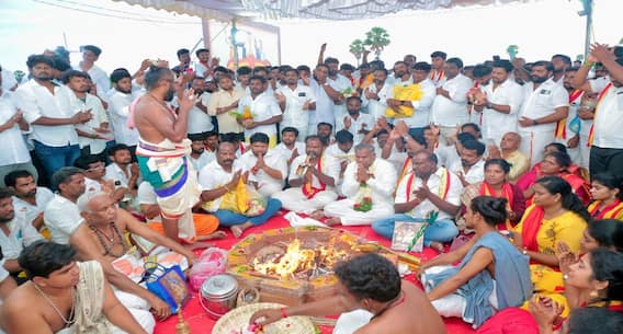 இன்று நடைபெற்ற த.வெ.க.,மாநாட்டின் பூமி பூஜைக்கு முன்னதாக கும்பங்கள் பூஜைக்கு தயார் செய்யப்பட்டு மதுரை பாண்டி முனீஸ்வரர், மடப்புரம் காளி, சமயபுரம் மாரியம்மன், கள்ளழகர் திருப்பரங்குன்றம் முருகன் உள்ளிட்ட பல்வேறு தெய்வங்களின் படங்கள் வைக்கப்பட்டிருந்தாலும் ஹைலைட்டாக எம்மதமும் சம்மதம் என்று குறிக்கும் வகையில் நடுவில் விநாயகர் மற்றும் வேளாங்கண்ணி மாதா குழந்தையுடன் மெக்கா படம் நடுவில் இடம் பெற்றது. 15 லட்சம் தொண்டர்கள் வருவார்கள் அவர்கள் பாதுகாப்பு வந்து பாதுகாப்பாக செல்லவே இந்த யாக பூஜைகள் நடைபெறுவதாகவும் தெரிவித்தனர்.