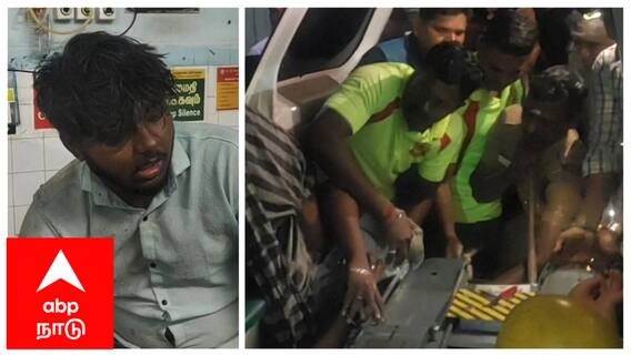 விபத்தில் படுகாயமடைந்த கல்லூரி மாணவர்களை மீட்டு சிகிச்சைக்காக ஆம்புலன்ஸில் அழைத்து வந்த நிலையில் ஆம்புலன்ஸில் இருந்த ஸ்ட்ரக்சரில் மாணவரின் தலை சிக்கியதை அடுத்து ஒருமணி நேரம் போராட்டத்திற்கு பிறகு தீயணைப்புத்துறை வீரர்கள் மாணவரை பத்திரமாக மீட்டுள்ளனர்.