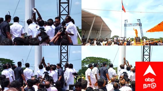 சிலை திறப்பு விழாவைத் தொடர்ந்து, 60 அடி உயர கொடிக்கம்பத்தில் திமுக கொடியை முதலமைச்சர் மு.க.ஸ்டாலின் ஏற்றி வைத்தார். அப்போது, கொடிக்கம்பத்தில் பொருத்தப்பட்ட தானியங்கி மோட்டார் இயங்காததால், அங்கிருந்த திமுக தொண்டர்கள் இரும்பு கொடி கம்பியை வெறும் கையால் உணர்ச்சிபொங்க இழுத்து ஏற்றி வைத்தனர். இது திமுக தொண்டர்களின் கட்சிப் பற்றையும், முதலமைச்சர் மீதான அவர்களது பற்றுதலையும் வெளிப்படுத்தும் நெகிழ்ச்சியான தருணமாக அமைந்தது. இந்த நிகழ்வு கூட்டத்தினர் மத்தியில் பெரும் கரவொலியைப் பெற்றது. இந்த நிகழ்வில் அமைச்சர்கள் சிவ.வி.மெய்யநாதன், கே.என்.நேரு, எம்.ஆர்.கே.பன்னீர்செல்வம் மற்றும் சட்டமன்ற உறுப்பினர்கள் உடனிருந்தனர். மாவட்ட திமுக சார்பில் முதலமைச்சருக்கு வெள்ளி செங்கோல் நினைவுப் பரிசாக வழங்கப்பட்டது.