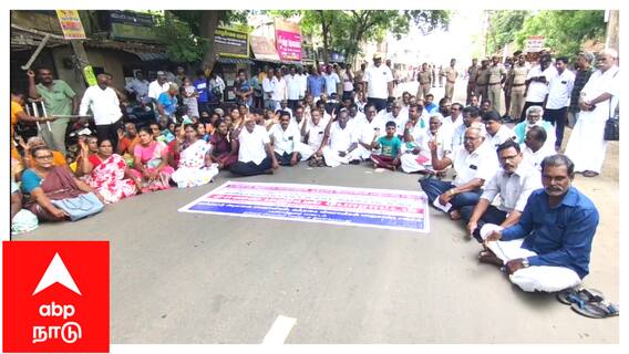 மயிலாடுதுறை மாவட்டத்தில் கோயில் இடங்களில் பல ஆண்டுகளாக குடியிருந்து வரும் பொது மக்களுக்கு மின் இணைப்பை தராமல் அலைகழித்து வரும் கிராம நிர்வாக அலுவலர்கள், ஊராட்சி, நகராட்சி மற்றும் மின்சார வாரியத்தையும், இதனை கண்டு கொள்ளாத மாவட்ட நிர்வாகத்தையும் கண்டித்து மயிலாடுதுறை கோட்டாட்சியர் அலுவலகம் முன்பு தமிழ்நாடு அடிமனை பயனாளிகள் குத்தகை விவசாயிகள் பாதுகாப்பு சங்கத்தினர் மாவட்டத் தலைவர் ராயர் தலைமையில் மயிலாடுதுறை திருவாரூர் சாலையில் சாலை மறியல் போராட்டத்தில் ஈடுபட்டனர்.