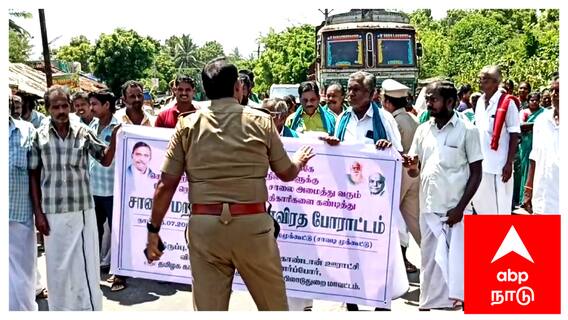 மயிலாடுதுறை வழியாக செல்லும் விழுப்புரம் நாகப்பட்டினம் நான்கு வழிச்சாலையால் விளை நிலங்களுக்கு செல்லும் பாதை துண்டிக்கப்பட்டதாக கூறி அப்பகுதி விவசாயிகள் நான்கு வழிச்சாலையில் சுரங்கம் அமைத்து இணைப்பு சாலை ஏற்படுத்தி தர வலியுறுத்தி போராட்டத்தில் ஈடுபட்டனர்.
