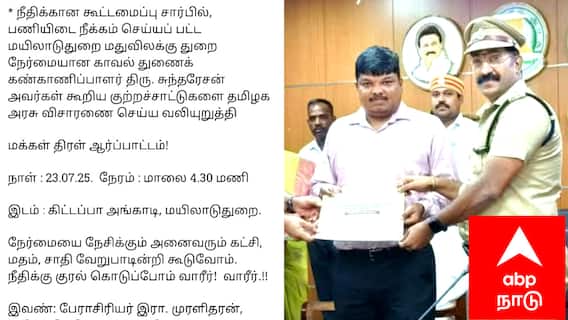 இந்த சூழலில் மயிலாடுதுறையில் நேர்மையாக பணியாற்றி, போதைப் பொருட்கள் தொடர்பான குற்றங்களை கணிசமாக குறைந்த ஓர் நேர்மையான அதிகாரி சஸ்பெண்ட் செய்யப்பட்டுள்ளதாக கூறி அவருக்கு ஆதரவாக மயிலாடுதுறை மாவட்டம் போராட்டம் நடத்த முடிவெடுத்துள்ளனர். அதனைத் தொடர்ந்து மயிலாடுதுறை மாவட்ட மக்கள் ஒன்றினைந்து நீதிக்கான கூட்டமைப்பு என்ற பெயரில் வருகின்ற 23.07.2025 புதன்கிழமை மாலை 4.30 மணிக்கு டிஎஸ்பி சுந்தரேசன் முன்வைத்த குற்றச்சாட்டுகள் குறித்து அரசு விசாரணை செய்யவேண்டும் என வலியுறுத்தி ஆர்ப்பாட்டம் நடைபெறும் என அறிவித்துள்ளார்.