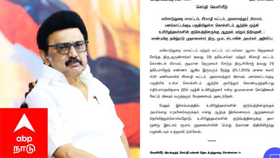 மயிலாடுதுறை மாவட்டம் மற்றும் வட்டம், பட்டமங்கல ஆராய தெருவைச் சேர்ந்த அருண்சங்கர் (வயது 22) மற்றும் சீர்காழி வட்டம், கொண்டல் கிராமம், குடியான தெருவைச் சேர்ந்த சிபிராஜ் (வயது 21) ஆகிய இருவரும் சீர்காழி வட்டம், அகரஎலத்தூர் கிராமம், பனங்காட்டங்குடி பகுதியில் உள்ள கொள்ளிடம் ஆற்றில் குளித்துக் கொண்டிருந்தபோது எதிர்பாராதவிதமாக நீரில் மூழ்கி உயிரிழந்தனர் என்ற துயரகரமான செய்தியைக் கேட்டு மிகவும் வருத்தமும் வேதனையும் அடைந்தேன். மேலும் இச்சம்பவத்தில், உயிரிழந்தவர்களின் குடும்பத்தினருக்கும், அவர்களது உறவினர்களுக்கும் எனது ஆழ்ந்த இரங்கலையும், ஆறுதலையும் தெரிவித்துக்கொள்வதோடு, உயிரிழந்தவர்களின் குடும்பத்தினருக்கு தலா மூன்று லட்சம் ரூபாய் முதலமைச்சரின் பொது நிவாரண நிதியிலிருந்து வழங்கிடவும் உத்தரவிட்டுள்ளார்.