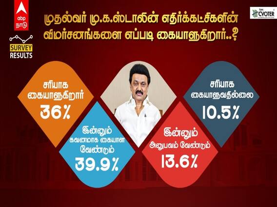 இந்த ஓராண்டில் மு.க.ஸ்டாலினின் தலைமையிலான அரசின் செயல்பாடுகள் பற்றி அரசியல் கட்சியினரிடம் ஏபிபி சி வோட்டர் கருத்துக்கணிப்பு நடத்தியுள்ளது. எதிர்க்கட்சிகள் வைக்கும் விமர்சனங்களை முதல்வர் மு.க.ஸ்டாலினின் எவ்வாறு எதிர்கொண்டுள்ளார் என்பது குறித்த கேள்விக்கு ஏபிபி சி வோட்டரின் கருத்துகணிப்பில் பல்வேறு தகவல்கள் கிடைத்துள்ளது. அவை கீழே வருமாறு: