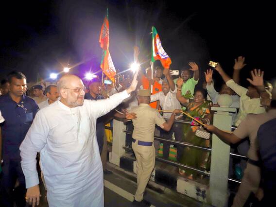 இதையடுத்து அமித்ஷா காரில் இருந்து கீழே இறங்கி, சாலையில் சிறிது தூரம் நடந்தபடி தொண்டர்களை பார்த்து கை அசைத்தார். அப்போது போலீஸ் தடுப்பையும் மீறி, தொண்டர்கள் பலர் சாலைகளில் வந்து அமித் ஷாவுக்கு கை கொடுத்து வாழ்த்து தெரிவித்தனர்.