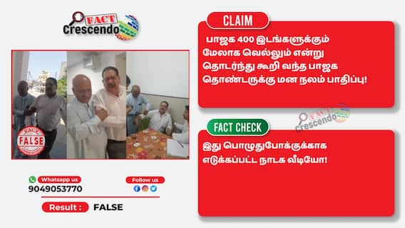 பாரதிய ஜனதா கட்சி நாடாளுமன்ற தேர்தலில் 400க்கும் மேற்பட்ட இடங்களில் வெற்றிபெறும் என்று கூறி கூறி பாஜக தொண்டர் ஒருவருக்கு மன நலம் பாதிக்கப்பட்டது என்று பரவும் வீடியோ திரைக்கதை எழுதி எடுக்கப்பட்ட நாடக வீடியோ என்பதை தகுந்த ஆதாரங்கள் அடிப்படையில் அடிப்படையில் உறுதி செய்துள்ளோம்.