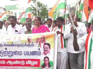 ராகுல் காந்தி நடைபயணம் மேற்கொண்டு ஒரு வருடம் ஆன தினத்தை முன்னிட்டு கரூரில் எம்.பி. ஜோதிமணி தலைமையில் காங்கிரஸ் கட்சியினர் ஊர்வலம் சென்றனர்.