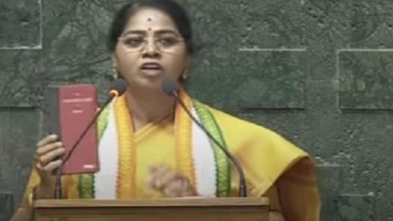 அதில் மயிலாடுதுறை தொகுதியில் போட்டியிட்டு வெற்றி பெற்ற காங்கிரஸ் வேட்பாளர் சுதா ராமகிருஷ்ணன், முருக கடவுளை கூறி பதவியேற்றது கவனம் பெற்றுள்ளது.